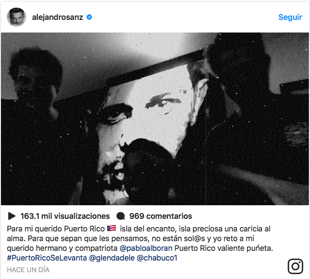 Alejandro Sanz ha sido uno de los muchos artistas que se ha volcado con el pueblo de Puerto Rico. La importante presencia de sus habitantes entre la comunidad latina de Miami, y que buenos amigos suyos como Chayanne, Luis Fonsi o Ricky Martin lo sufran como algo propio, le han llevado a ponerse en primera línea.