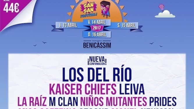 Los Del Río se unen así a un cartel de much enjundia, en elque ya destacaban grandes grupos como Kaiser Chiefs, La Raíz, M-Clan, Miss Cafeína o Manel, a los que se une además Leiva, para completar una carta muy apetitosa para los amantes de la buena música. El festival se celebrará entre los días 13 y 16 de abril en Benicasim, Castellón, y las entradas se pueden adquirir ya a partir de 44 euros.