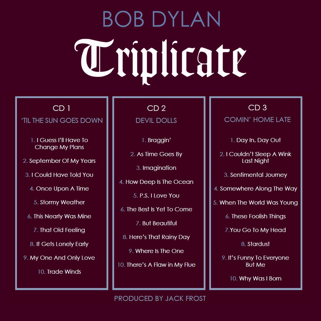 Para Robert Zimmerman, el verdadero nombre de Dylan, es " un verdadero placer versionar a Frank Sinatra". Y también al resto de artistas presentes en Triplicate, como Billie Holiday u Hoagy Carmichael. Algunas de las canciones "más conmovedores nunca escritas" están en su disco, en palabras de Dylan. Y es que esta trilogía de homenajes ha sido una suerte de homenaje a otros músicos que, a lo largo de su carrera, le han inspirado y motivado en sus craciones.