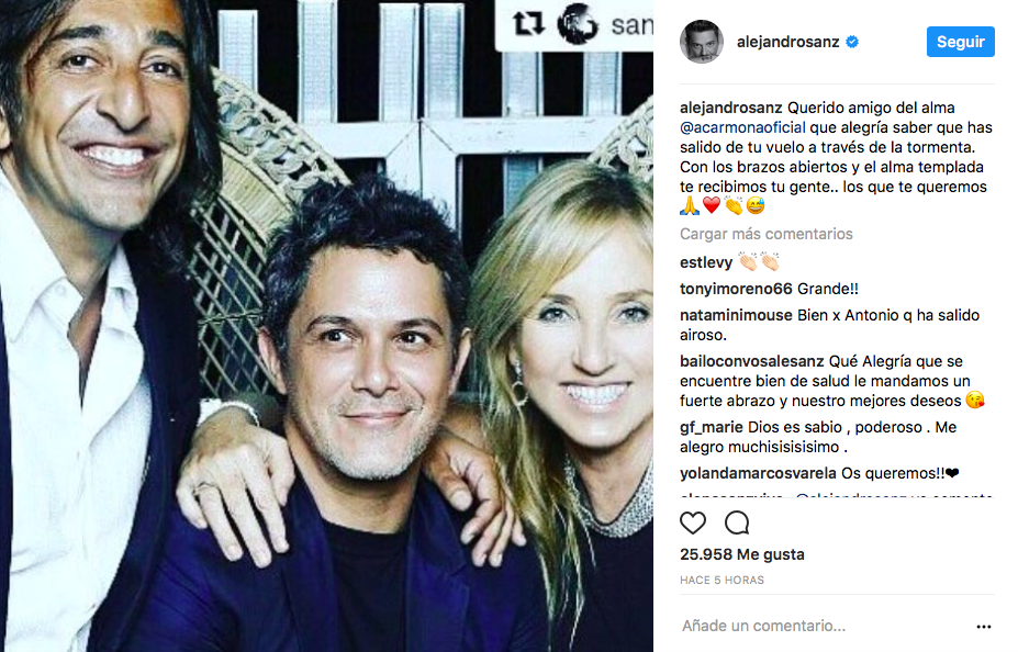 Alejandro Sanz ha querido mostrar su apoyo en un momento tan difícil a Antonio Carmona, músico de su generación con el que mantiene una excelente relación. "Con el alma templada y los brazos abiertos te recibimos tu gente, los que te queremos". Unas emotivas palabras dirigidas al ex líder de Ketama que, seguro, las habrá recibido con mucho cariño.