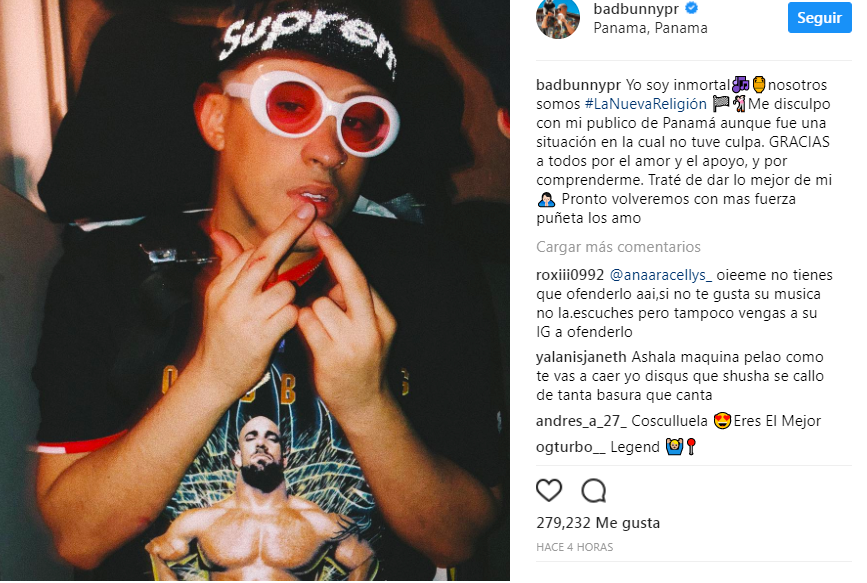 Al día siguiente, a través de su cuenta de Instagram, el cantante aprovechó para "pedir disculpas por una situación de la que no tengo la culpa" y a su vez dar "gracias a todos por el amor yel apoyo mostrados" porque "traté de darlo mejor de mí". Así mismo, Bad Bunny aseguró que el parón sería muy breve y que "pronto estaremos de nuevo, con más fuerza que nunca".