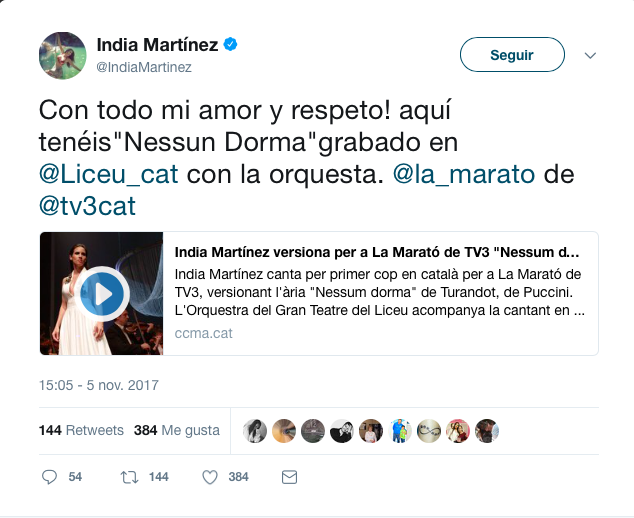 India Martínez publicó su actuación en sus redes sociales en un mensaje cargado de humildad. "Con todo mi amor y respeto" rezaba un tweet en el que compartía la actuación que protagonizó en el Liceu de Cataluña durante el maratón organizado por la televisión autonómica TV3.
