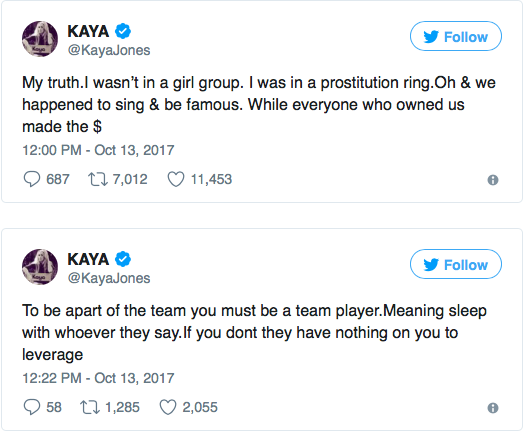 Las palabras de Kaya Jones son de una dureza extrema, y describen una situación de abusos generalizada y prolongada en el tiempo que debería conllevar una profunda investigación. Según la cantante, mientras existieron las Pussycat Dolls "nos limitamos a cantar y ser famosas mientras nuestros dueños se forraban con ello". Pero las palabras más duras estaban por llegar. Acto seguido afirmó que se veían obligadas a "acostarse con quien nos decían" bajo amenaza de "acabar con nuestra carrera musical e incluso con nuestra vida".