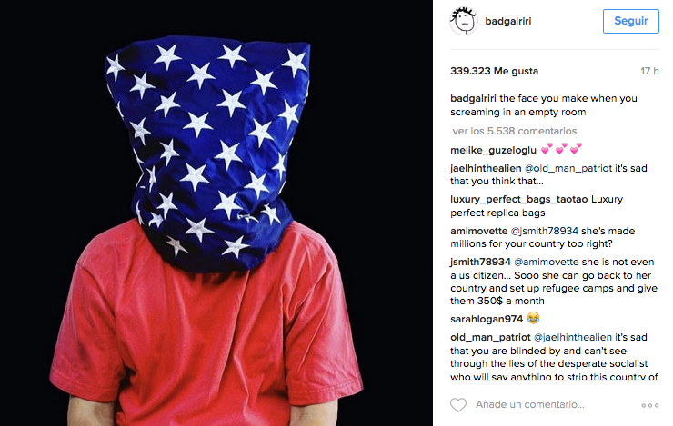 Ante estas palabras, Rihanna no ha podido resistirse a contestar a Banks y lo ha hecho en Instagram, donde ha colgado una imagen de ella con cara burlona y el subtítulo “la cara que pones cuando eres inmigrante” y otra con el rostro de alguien tapado por la bandera americana con el texto “la cara que pones cuando gritas en una habitación vacía”, ridiculizando la paupérrima popularidad de las opiniones de Banks, notable partidaria de Trump. Por supuesto, Banks ha contraatacado poco después, destacando la ironía de que Rihanna la acuse de gritar en una habitación vacía cuando ella misma la ha contestado y después con difamaciones del tipo “me abro de piernas a cualquier hijo de puta que pueda conseguir que me escriba canciones o me compre drogas” o “apenas puedo actuar en directo porque me lío los porros con metanfetamina", Azealia no se anda con rodeos :-/
